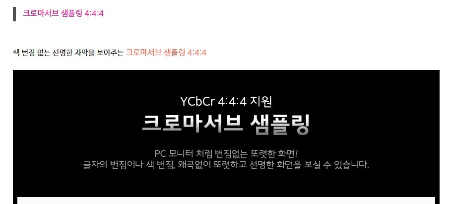 티비의 기능 설명을 보다보면 크로마서브 샘플링이라면서 글씨를 선명하게 보여준다는 기능광고를 자주 보실 수 있습니다. 하지만 정작 이게 어떻게 작동하는지는 개념도 잘 모르는게 현실이고 그냥 뭉뚱그려 TV를 모니터로 사용할 수 있는 기능이라고만 생각합니다.