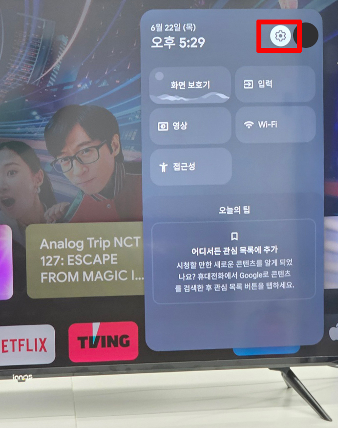 리모컨의 톱니바퀴 모양을 눌러 설정 창을 열어줍니다. 박스 표시가 된 톱니 바퀴 모양 위에서 OK 버튼을 누르면 안으로 들어갈 수 있습니다.