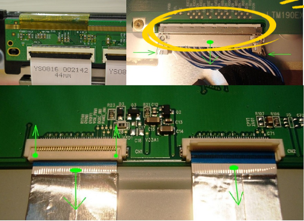 TV에서 사용되는 플랫 케이블은 매우 얇기 때문에 손상이 쉽습니다. 따라서 케이블의 연결을 해제할 때 힘을 주어 잡아당기거나, 꺾지 말아주셔야 합니다. 위 이미지에서 노란색으로 표시한 곳이 케이블 잠금 장치입니다. 굉장히 얇기 때문에 손톱으로 살짝 위로 올려주시면 대부분 쉽게 연결이 풀립니다.